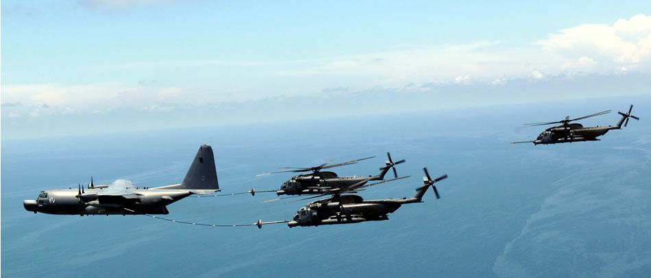 MH-53 Pave Low helicopters from the 20th Special Operations Squadron at Hurlburt Field, Fla., fly over a live-fire range June 12 at Eglin Air Force Base, Fla. The interactive defensive avionics system greatly enhances the defensive capabilities of the Pave Low, providing a new level of detection avoidance with near real-time threat broadcasts over-the-horizon, so crews can avoid and defeat threats, and replan en route if needed. (U.S. Air Force photo/Senior Airman Emily Moore)