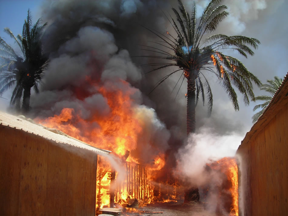 FALLUJAH, Iraq (June 25, 2008) Structures burn June 25 at Entry Control Point-5 (ECP-5), a post where Marines and Iraqi Police safeguard entrants into the city of Fallujah. Despite Marine and Iraqi firemen efforts, the fire destroyed most structures at the compound over watched by Company L, 3rd Battalion, 6th Marines and Iraqi policemen. The company said they received overwhelming support from Iraqi locals and from stateside supporters. (Official U.S. Marine Corps photo by Company L, 3rd Battalion, 6th Marines)