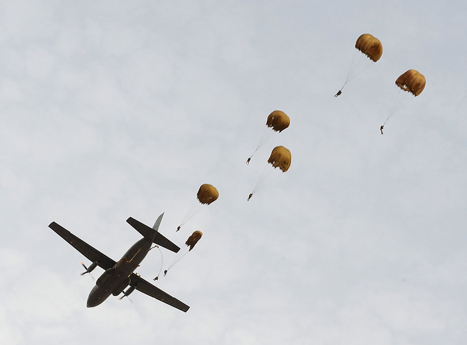 U.S. Air Force Guardian Angels assigned to the 82nd Expeditionary Rescue Squadron, French foreign legionnaires and French special forces soldiers jump from a French C-160 Transall during an exercise in the desert near Camp Lemonier. The 82nd ERQS and the French military coordinated the jump to promote interoperability between the two militaries. Photo by Petty Officer 1st Class Jonathan Kulp