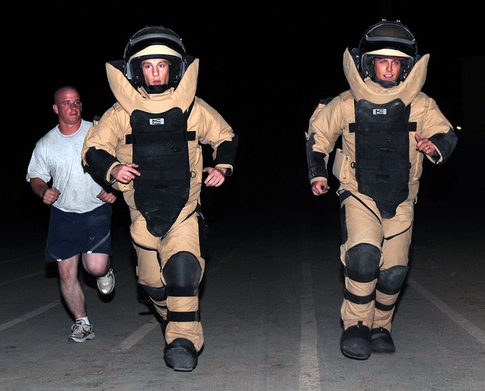 Staff Sgt. Anthony Sennhenn and Tech. Sgt. Scott Williams, 506th Explosive Ordnance Disposal, team member and team leader, run a mile wearing bomb suits weighing approximately 60 pounds each, Sept. 12. The Airmen were gauging their ability to meet or set the record for running a mile with the suit in under nine minutes, 58 seconds. Sgt. Sennhenn, a Ashland, Wis., native, is deployed here from the 99th Civil Engineer Squadron, Nellis Air Force Base, Nev. Sgt. Williams, an Andrews, Md., native, is deployed here from the 316th Civil Engineer Squadron, Andrews Air Force Base, Md Photo by Staff Sgt. Joshua Breckon