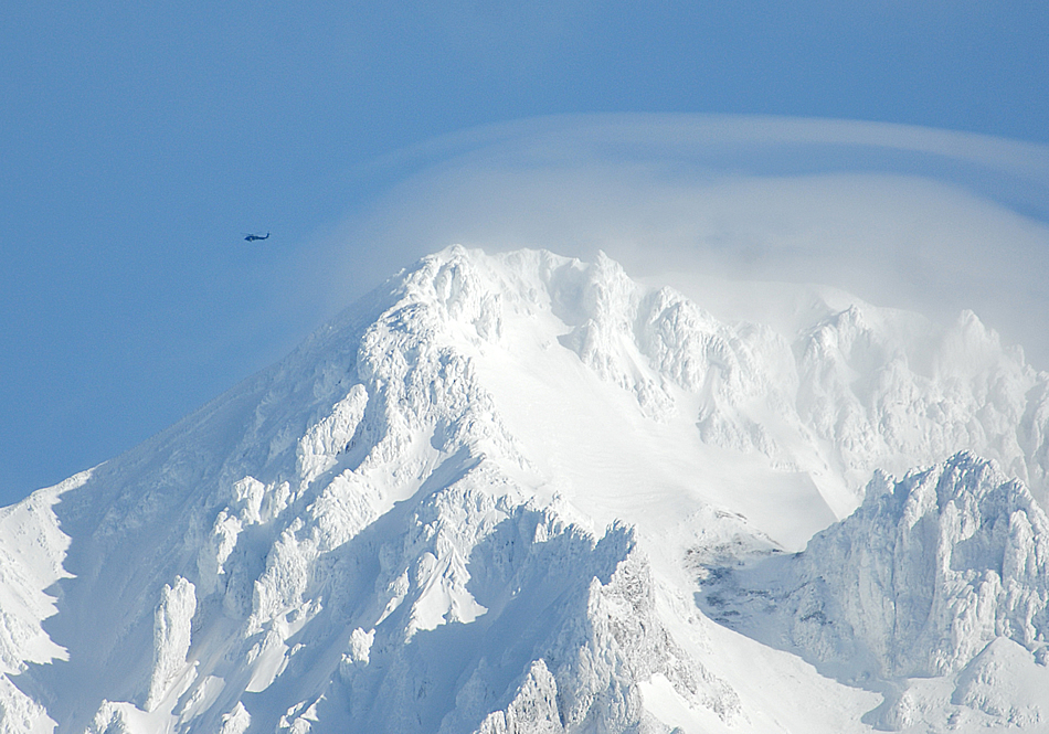 An Oregon Army National Guard UH-60 Blackhawk helicopter hovers over Mount Hood, Ore., while searching for missing climbers Dec., 14. The UH-60 Black Hawk was called out to assist the Clackamas County Sherriff's Office to help attempt to locate the climbers. Photo by Sgt. Eric Rutherford
