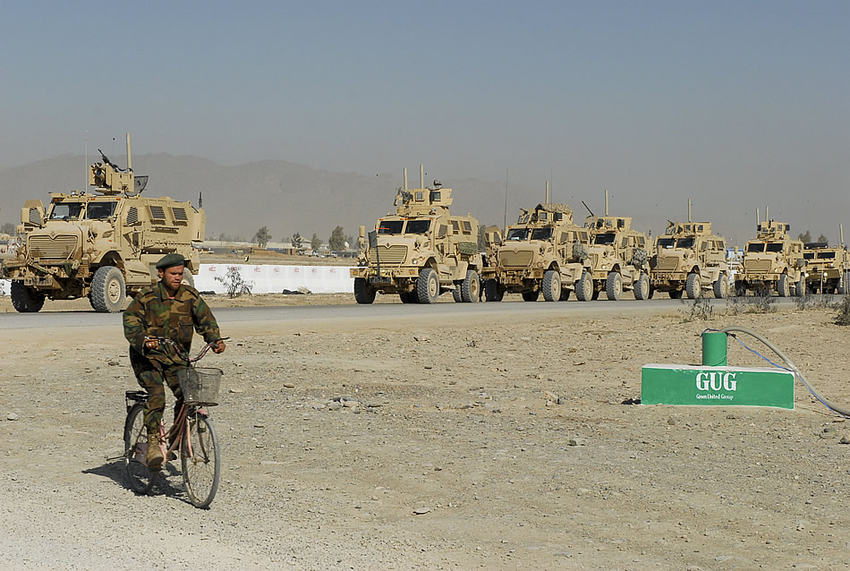 An Afghan service member on his bicycle passes in front MRAP vehicles that are a part of a massive convoy to help the 215th Corps of the Afghan national army move personnel and equipment to Helmand province where Operation Moshtarak is taking place. The convoy consisted of 140 vehicles. Photo by Sgt. Chris Florence