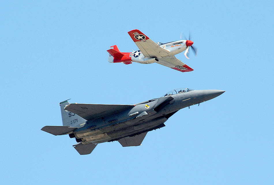 An F-15E Strike Eagle and P-51 Mustang perform a heritage flight Aug. 15, 2010, during the Abbotsford International Air Show in British Columbia. The F-15E is assigned to the 4th Fighter Wing at Seymour Johnson Air Force Base, N.C. (U.S. Air Force photo/Staff Sgt. Larry E. Reid Jr.)