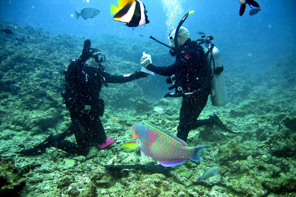 U.S. Marine Lt. Col. Brian Ehrlich, right, re-enlists U.S. Marine Corps Sgt. Aron D. Jarvi during an underwater ceremony at Maeda Point, Okinawa, Japan, Nov. 30, 2010. Jarvi, an avid scuba diver, enlisted in the Marine Corps for his second time during the ceremony. He is a warehouse clerk assigned to the Supply Battalion, Combat Logistics Regiment 35, 3rd Marine Expeditionary Force. U.S. Marine Corps photo by Lance Cpl. Robert J. Maurer