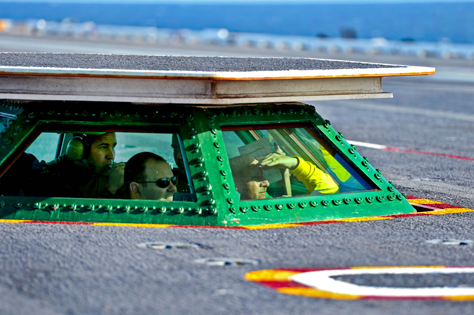 U.S. sailors observe flight operations on the flight deck aboard the aircraft carrier USS George H.W. Bush under way in the Atlantic Ocean, Jan. 10, 2013. U.S. Navy photo by Petty Officer 3rd Class Kevin J. Steinberg