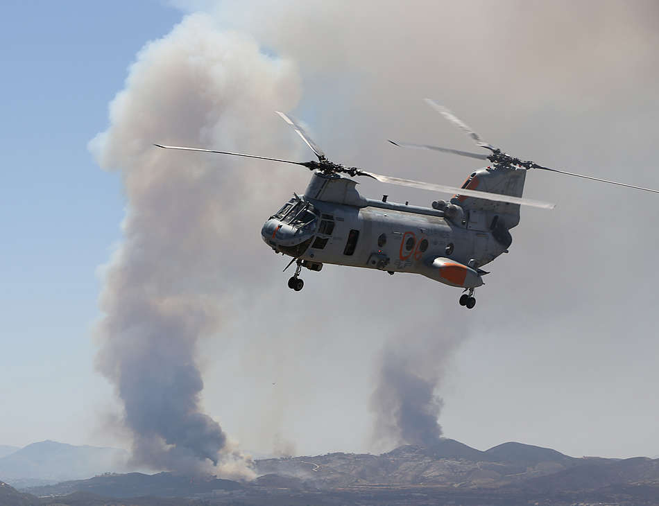 U.S. Marines with Marine Medium Helicopter Squadron (HMM) 364, Marine Aircraft Group 39, 3rd Marine Aircraft Wing (MAW) from Marine Corps Base Camp Pendleton, assist in the efforts of containing the Cocos Fire in San Marcos, Calif., May 15, 2014. 3rd MAW partnered with the Calif. Department of Forestry and Fire Protection to conduct aerial firefighting against several wildfires ablaze in San Diego County. (U.S. Marine Corps photograph by Corporal Tyler C. Gregory, 3rd MAW COMCAM)