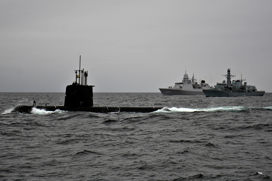 ATLANTIC OCEAN (May 4, 2015) Swedish submarine HMS Gotland, left, HNLMS Tromp (F 803), center, and HMS Portland (F 79) steam in formation with other NATO and partner nation ships during maneuvering drills as a part of exercise Dynamic Mongoose. Dynamic Mongoose is an annual anti-submarine warfare (ASW) live exercise conducted off the coast of Norway comprised of surface, sub-surface, and aviation forces from 11 NATO and partner nations aimed to strengthen interoperability and practice ASW techniques in a unique and challenging environment. (U.S. Navy photo by Mass Communication Specialist 2nd Class Amanda S. Kitchner)