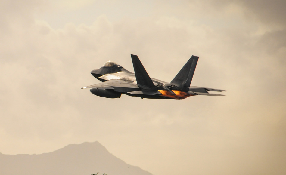 A Hawaii Air National Guard F-22 Raptor takes off from Joint Base Pearl Harbor-Hickam, Hawaii, Sept. 26, 2015. The Raptors deployed to the U.S. Central Command area of responsibility. It was the first combat deployment for the 199th Fighter Squadron since it deployed to Saudi Arabia in 2000 to patrol the southern no-fly zone of Iraq. (U.S. Air National Guard photo/Airman 1st Class Robert Cabuco)