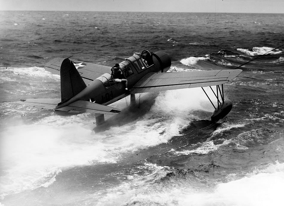 Vought OS2U Kingfisher floatplane, of Observation Squadron One (VO-1) Taxiis alongside USS Arizona (BB-39), after a flight in the Hawaiian Operating area, 6 September 1941. Pilot is Lieutenant-Commander Welton D. Rowley, Commanding Officer of VO-1. Rear-seat man, Radioman 2nd Class E.L. Higley, is preparing to go out on the plane's wing to hook up the aircraft to the battleship's crane for recovery. The plane is numbered 1-O-1. Official U.S. Navy Photograph