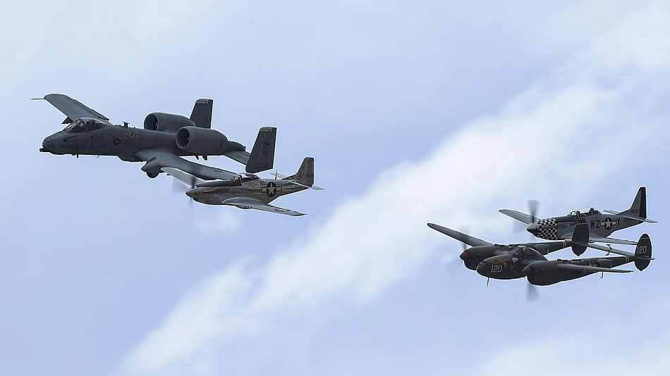 A U.S. Air Force A-10C Thunderbolt II, a P-51 and TF-51 Mustang, and a P-38 Lightning fly together during the 2017 Heritage Flight Training and Certification Course at Davis-Monthan Air Force Base, Ariz., Feb. 12, 2017. The HFTCC provides civilian and military pilots the opportunity to practice flying in formation together in preparation for the upcoming air show season. (U.S. Air Force photo by Senior Airman Chris Drzazgowski)
