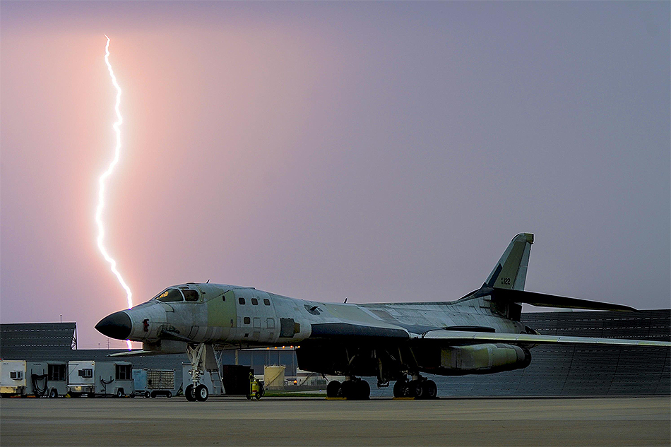 Lightning strikes behind a B-1B Lancer parked on the flight line as a major storm approaches Tinker Air Force Base, Okla. May 18, 2017. The B-1B is at Tinker AFB undergoing depot-level maintenance and has been stripped of the majority of its paint. (U.S. Air Force photo/Greg L. Davis)