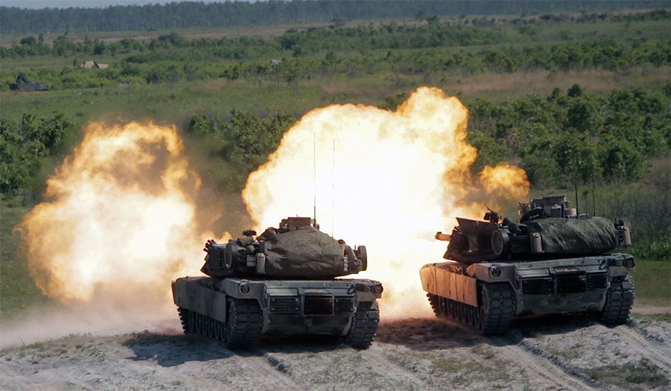 May 23, 2017 CAMP LEJEUNE, N.C. - Marines deliver synchronized fire in their M1A1 Abrams tanks during a fire mission at Marine Corps Base Camp Lejeune, N.C., May 17, 2017. The Marines are participating in Burmese Chase, an annual, multi-lateral training exercise between U.S. armed forces and NATO members. Photo By: Pfc. Taylor Cooper