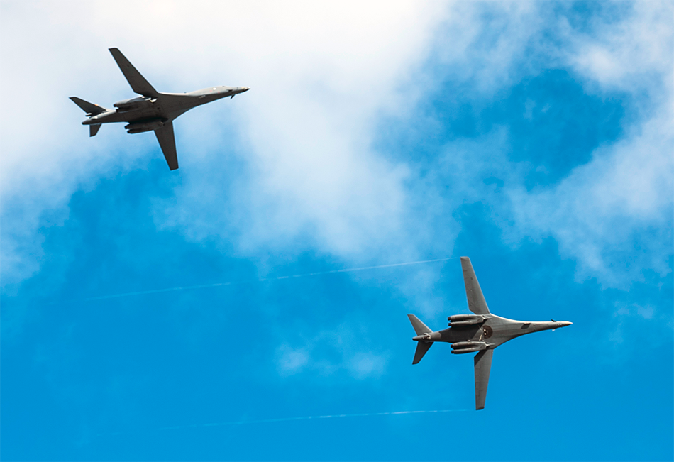 Two U.S. Air Force B-1B Lancers assigned to the 37th Expeditionary Bomb Squadron (EBS), deployed from Ellsworth Air Force Base (AFB), S.D., fly over Andersen AFB, Guam, July 26, 2017. The 37th EBS replaces the 9th EBS from Dyess AFB, Texas, which is currently supporting U.S. Pacific Command’s Continuous Bomber Presence mission. Incorporating the B-1 into Pacific Command operations, exercises the Air Force’s ability to integrate a unique capability with regional allies and partners in various parts of the world. (U.S. Air Force photo/Tech. Sgt. Richard P. Ebensberger)