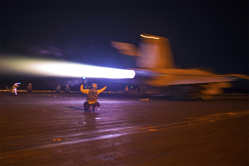 An F/A-18F Super Hornet launches from the flight deck of the aircraft carrier USS Nimitz during night flight operations in the Arabian Gulf, Oct. 5, 2017. The Nimitz is in the U.S. 5th Fleet area of operations supporting Operation Inherent Resolve. Navy photo by Petty Officer 3rd Class Ian Kinkead