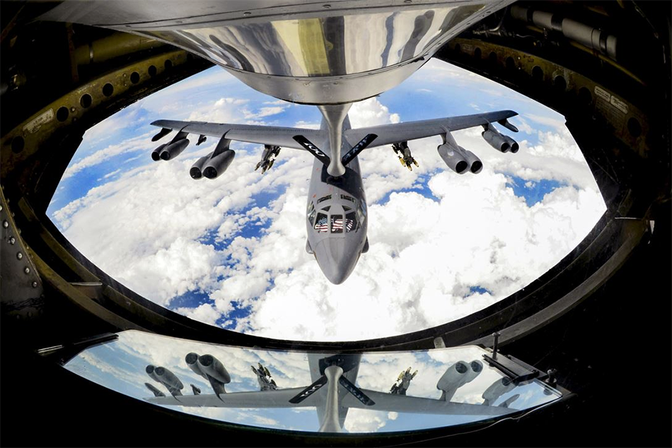 An Air Force B-52 Stratofortress aircraft receives fuel from a KC-135 Stratotanker over the Mediterranean Sea, Sept. 27, 2017. The KC-135 provided more than 55,000 pounds of fuel to the B-52. Air Force photo by Senior Airman Tenley Long