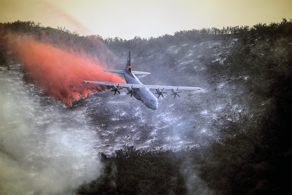 A California Air National Guard C-130J Hercules drops fire retardant over the hills above Santa Barbara, Calif., Dec. 13, 2017, while helping fight the Thomas Fire. The aircraft is assigned to the 146th Airlift Wing. Air National Guard photo by Staff Sgt. Nieko Carzis