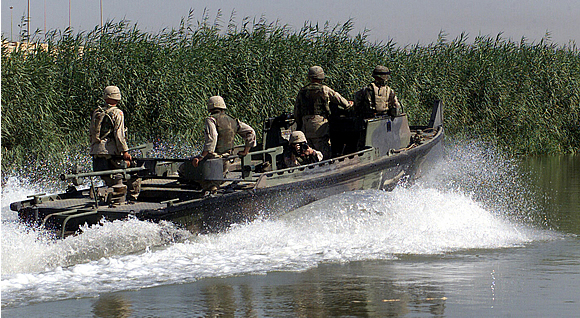 The 671st Engineer Company, Portland Ore,, conducts boat patrols along the Tigris river in Baghdad.