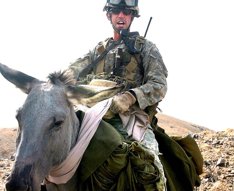 October 13, 2005Staff Sgt. Matthew Sheppard from the 325th Airborne Infantry Regiment, patrols Lwar Kowndalan, Afghanistan by donkey (visit http://www4.army.mil/ocpa/read.php?story_id_key=8046). Photo by Spc. Mike Pryor