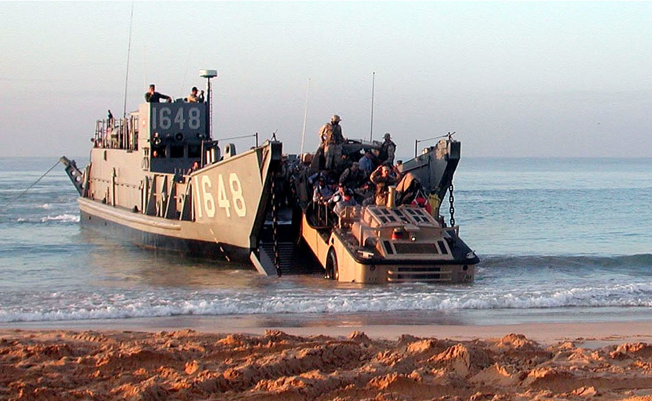 A Landing Craft Utility or LCU unloads equipment on the beach here. The 15th Marine Expeditionary Unit (Special Operations Capable) has been providing desperately needed humanitarian aid to cities and villages along the coast of Sri Lanka's southern coastline.