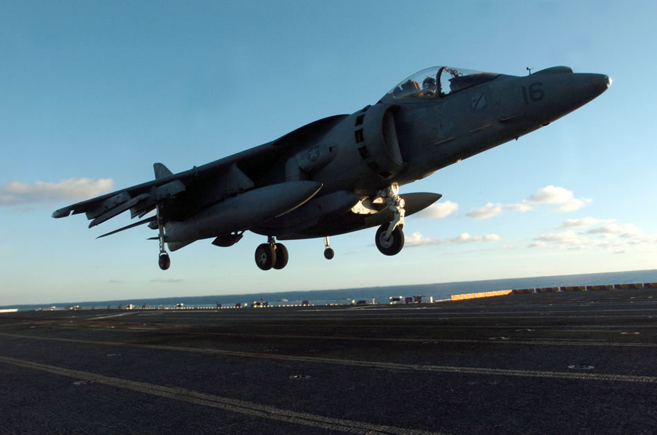 Pacific Ocean (Dec. 3, 2005) - An AV-8B Harrier, assigned to the �Black Sheep� of Marine Attack Squadron Two One Four (VMA-214), prepares to land on the flight deck of the amphibious assault ship USS Peleliu (LHA 5). Peleliu and Expeditionary Strike Group Three (ESG-3) are underway off the coast of Southern California conducting Composite Unit Training Exercise (COMPTUEX) in preparation for an upcoming scheduled deployment. U.S. Navy photo by Journalist 2nd Class Zack Baddorf.