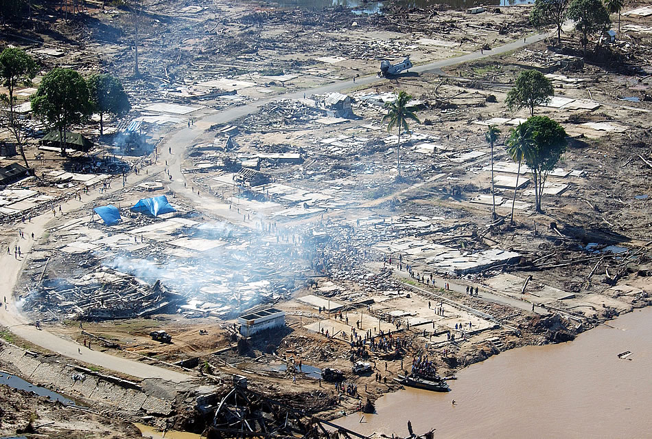 01/16/05 - Residences of a remote region in Indonesia flock to a humanitarian aid distribution point after a CH-46 assigned to Marine Medium Helicopter 262 (HMM-262), Futemna Marine Corps Air Station, Japan lands with aid supplies, Jan. 16, 2005. HMM-262 is currently aboard the USS Fort McHenry (LSD 43) performing helo operations in support of Operation Unified Assistance to aid those affected by the Dec. 26, 2004, Indian Ocean tsunami. (U.S. Air Force photo by Tech. Sgt. Scott Reed)