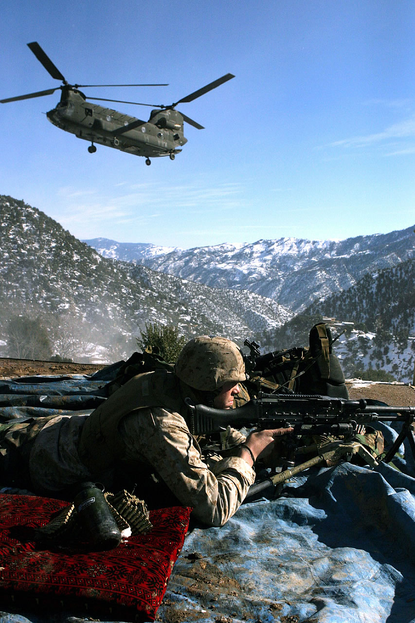 hi-res 	Lima Co. machine gunner, Josh Ploetz, looks over the sights of his M240G machine gun as ar CH47 Chinook helicopter prepares to drop medical supplies near the Marines' position high in the Hindu Kush mountains during Operation Spurs. Photo by Cpl. Rich Mattingly