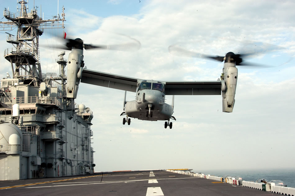 03/23/05 - The Marine MV-22 Osprey is attached to VMX-22 from Marine Corp. Air Station (MCAS) New River, N.C. takes off from the flight deck aboard USS Nassau (LHA 4), on March 23, 2005. Nassau worked with the Osprey for the first time during a weeklong underway. Nassau's Air Department spent a month preparing for the evolution by sending personnel to Chambers Field, Norfolk, Va. to view the Osprey during flight operations. (U.S. Navy photo by Photographer's Mate 3rd Class Andrew King)