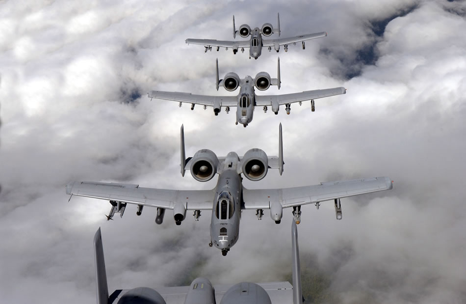 Four A-10s from the 111th Fighter Wing, Willow Grove Air Reserve Station, Pa., fly in formation after taking on fuel from a KC-10A Extender from the 514th Air Mobility Wing, McGuire Air Force Base, N.J., May 25, 2005. The A-10s were on a training mission that included the air refueling. U. S. Air Force photo by Kenn Mann