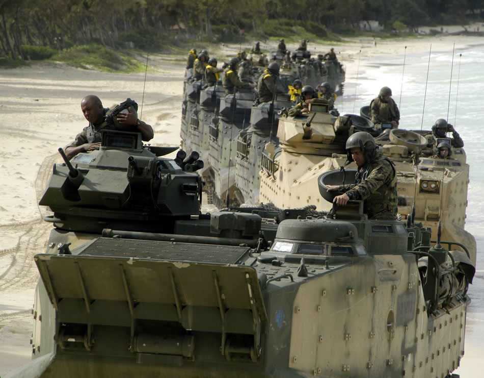 06/27/05 - A convoy of Marine Amphibious Assault Vehicles snakes down the beach on Kauai, Hawaii, as the Marines prepare to return to the USS Peleliu (LHA 5) after combat training exercises on June 27, 2005. The Marines from the 3rd Amphibious Assault Battalion are conducting amphibious training on the beaches of the Pacific Missile Range Facility on Kauai. DoD photo by Petty Officer 2nd Class Prince A. Hughes III, U.S. Navy.