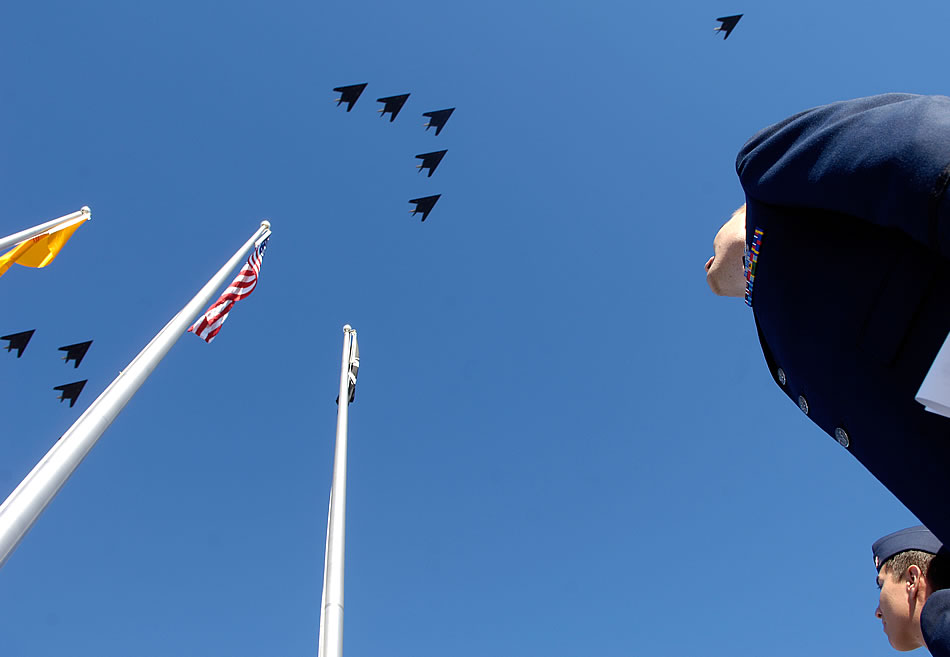 Capt. Heath Armstrong (front) and 2nd Lt. Scott Panzer watch as a formation of F-117 Nighthawks pass overhead. The formation was part of the Nighthawk's 25th anniversary/250,000 flying hour celebration at Holloman Air Force Base, NM. The formation consisted of 25 planes staggered into 5 separate groups. Capt. Armstrong and Lt. Panzer are part of the 49th Operations Support Squadron. (U.S. Air Force photo/Senior Airman Brian Ferguson)