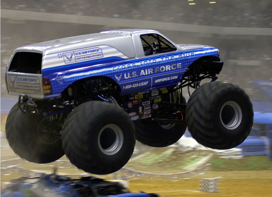 SAN ANTONIO (AFPN) -- Afterburner, the Air Force's new monster truck, flies toward the finish line at the San Antonio Monster Jam. This is only the second race in which the truck, one of the newest Air Force recruiting tools, has competed. Afterburner, driven by Paul Cohen, made the finals Jan. 14, but was edged out by Grave Digger. (U.S. Air Force photo by Senior Airman Brian Ferguson)