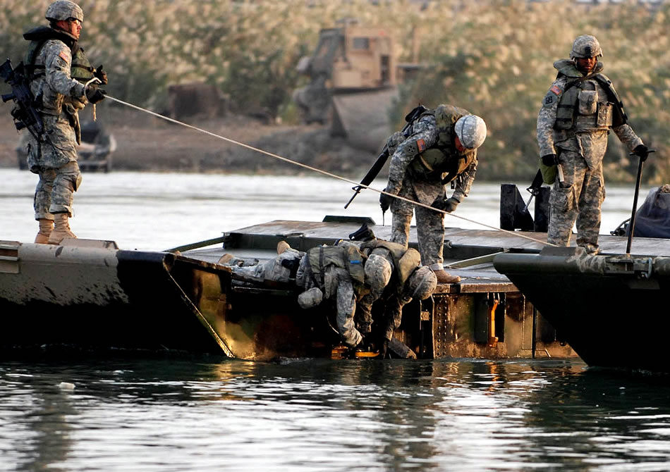 Soldiers from U.S. Army Europe's 502nd Engineer Company lock assault float bridge bay sections together to ferry vehicles and heavy equipment across the Euphrates River in support of Operation Marne Courageous Nov. 16. Photo by Staff Sgt Tony Lindback
