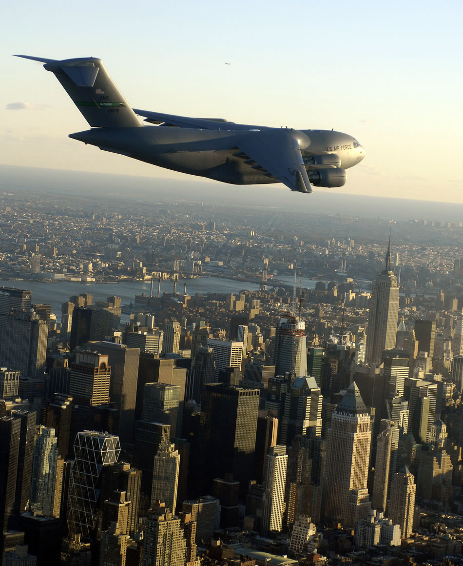 A C-17 Globemaster III flies over New York City after completing the first transcontinental flight on synthetic fuel Dec. 17. The C-17 took off before dawn from McChord Air Force Base, Wash., and landed in the early afternoon at McGuire AFB, N.J. (U.S. Air Force)