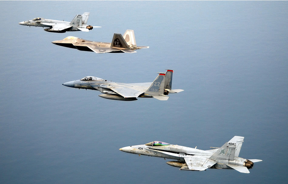 03/16/07 - From left, a U.S. Navy F/A-18E Super Hornet aircraft from Strike Fighter Squadron (VFA) One One Five, a U.S. Air Force F-22A Raptor aircraft from the 27th Expeditionary Fighter Squadron, a U.S. Air Force F-15C Eagle aircraft from the 44th Fighter Squadron and an F/A-18C Hornet aircraft from VFA-25 fly in formation during joint exercises between the U.S. Navy and Air Force in the Philippine Sea March 16, 2007. VFA-115 and VFA-25 are part of Carrier Air Wing 14 embarked aboard USS Ronald Reagan (CVN 76). The Ronald Reagan Carrier Strike Group is under way on a surge deployment in support of U.S. military operations in the Western Pacific. (U.S. Navy photo by Lt. Cmdr. Eric Tidwell)