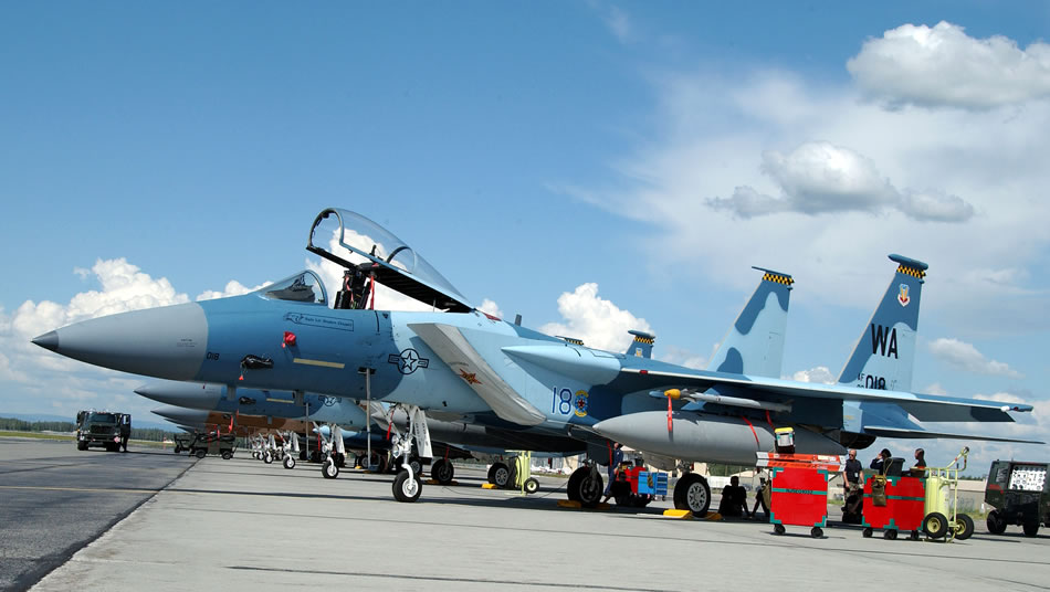 An F-15 Eagle from the 65th Aggressor Squadron at Nellis Air Force Base, Nev., sits parked on the Eielson AFB, Alaska, flight line July 9. The 65th AGS is taking part in Red Flag-Alaska 07-3, a multi-service, multi-platform coordinated, combat operations exercise, which runs through the July 27. (U.S. Air Force photo/Airman 1st Class Christopher Griffin)