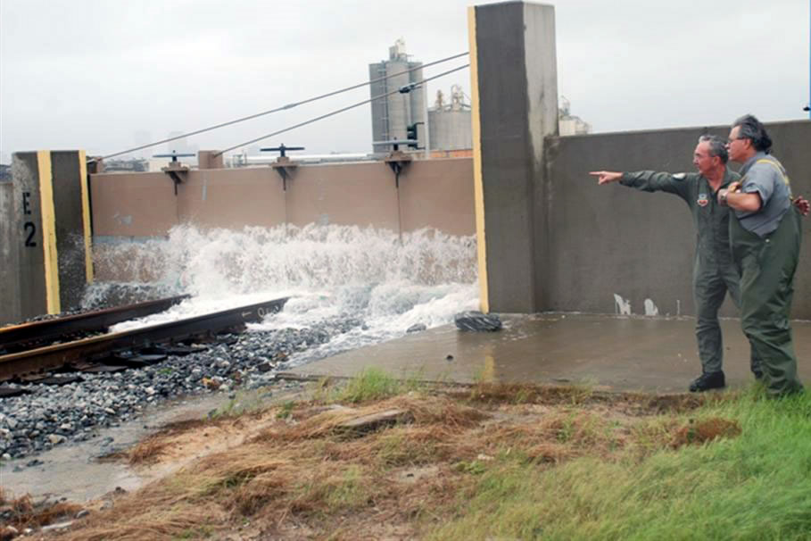 Louisiana Air National Guard Brig. Gen. John B. Soileau, right, commander of Task Force Gator in New Orleans, talks with a New Orleans official at a site where water is leaking through the flood gate on Sept. 1, 2008. Soileaus task force has been assisting the New Orleans Police Department with security operations since June 2006. U.S. Army photo by Sgt. Michael L. Owens