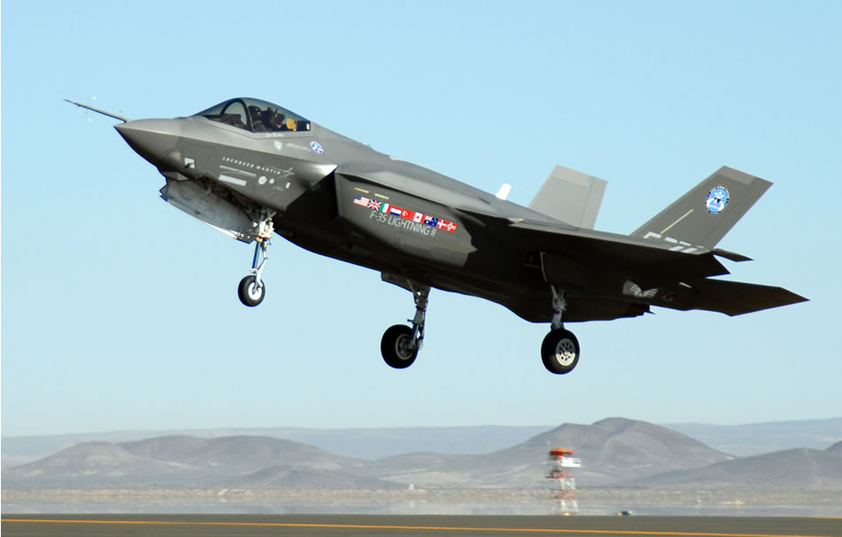 An F-35 Joint Strike Fighter, marked AA-1, lands Oct. 23 at Edwards Air Force Base, Calif. The F-35 Integrated Test Force staff concluded an air-start test. (U.S. Air Force photo/Senior Airman Julius Delos Reyes)