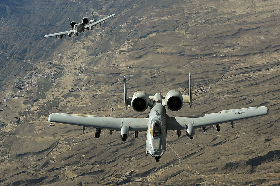 Two A-10 Thunderbolt IIs fly over Afghanistan providing top cover for ground forces. A-10s perform shows of force and provide armed aerial overwatch in support of Operation Enduring Freedom. (U.S. Air Force photo/Staff Sgt. Aaron Allmon)