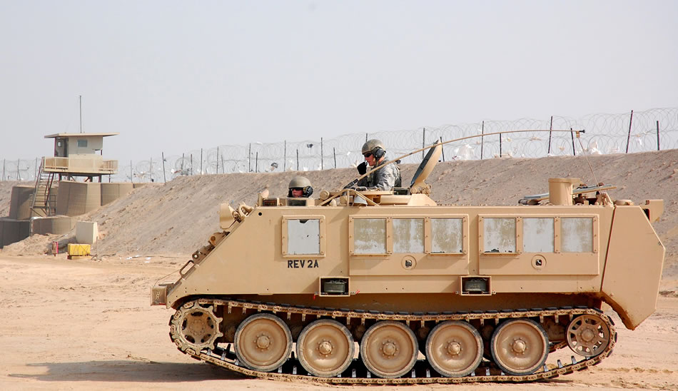 Senior Airman Travis Hummel (standing) and Airman 1st Class Adam Giebitz patrol Feb. 10 in an M-113 Armored Personnel Carrier at the Theater Internment Facility at Camp Bucca, Iraq. Airmen Hummel and Giebitz are deployed from Robins Air Force Base, Ga., and are assigned to the 886th Expeditionary Security Forces Squadron's quick response force. The QRF responds to issues within the TIF in which a show of force or escalation of force is required beyond the capabilities for the TIF's guard force. (U.S. Air Force photo/Capt. Jason McCree)