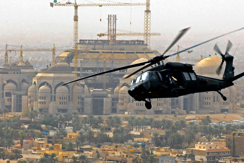 A UH-60 Black Hawk helicopter flies over a mosque during a routine flight in Baghdad, Iraq, Feb. 27, 2009. The helicopter crew is assigned to 1st Battalion, 244th Assault Helicopter Battalion. U.S. Army photo by Staff Sgt. Lynette Hoke