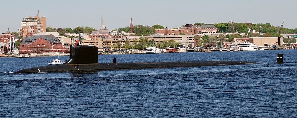 The Virginia-class submarine USS Hawaii transits the Thames River, enroute to her new homeport of Naval Station Pearl Harbor, Hawaii. Commissioned May 5, 2007, Hawaii is the third Virginia-class attack submarine constructed and the first submarine to be named after the Aloha state. Photo by Lt. Patrick Evans