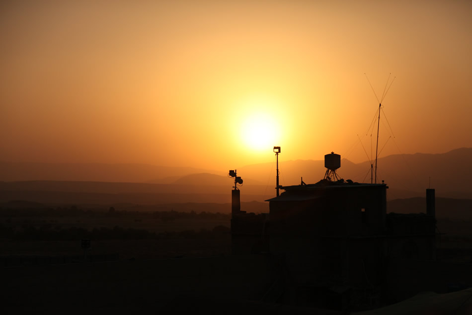A sunset view of the tactical operation center at Forward Operating Base Connolly, Afghanistan, July 17, 2009. Photo by Staff Sgt. Christopher Allison