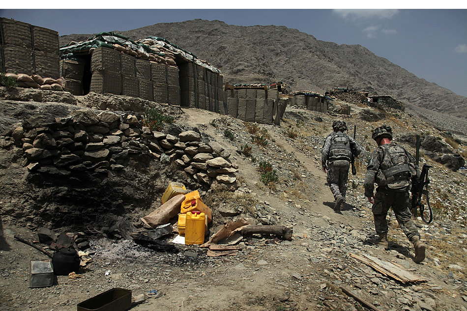 Command Sgt. Maj. Jimmy Carabello and Lt. Col. Mark O'Donnell, far right, make their way to a fighting position to check on Soldiers at Vehicle Patrol Base Badel, Konar province, Afghanistan, Aug. 14. The Soldiers are the senior leaders of 1st Battalion, 32nd Infantry Regiment. Photo by Staff Sgt. Andrew Smith
