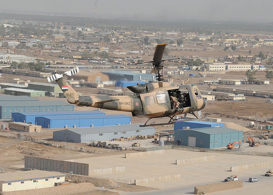 Air Force instructors assigned to the 721st Air Expeditionary Advisory Squadron fly on a training mission here with their Iraqi students, Oct. 8, as the Iraqi pilots perform aerial formation flying procedures. The U.S. Airmen train them on approaches, take-offs, landings and remote operations consisting of landing in unfamiliar landing zones. Air Force instructor pilots assigned to the 721st AEAS train, advise and assist Iraqi helicopter pilots around the clock, helping the Iraqis develop their air force. Photo by Tech. Sgt. Johnny Saldivar