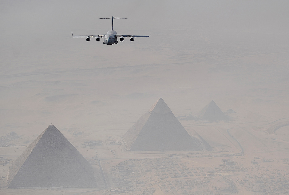 A C-17 Globemaster III flies over the Pyramids of Giza Oct. 15, 2009, during Exercise Bright Star. Bright Star is a joint international military airdrop exercise that strengthens and enhances the cohesiveness of each country's participating forces. The C-17 crew is from the 437th Airlift Wing at Charleston Air Force Base, S.C. (U.S. Air Force photo/Staff Sgt. Jacob N. Bailey)