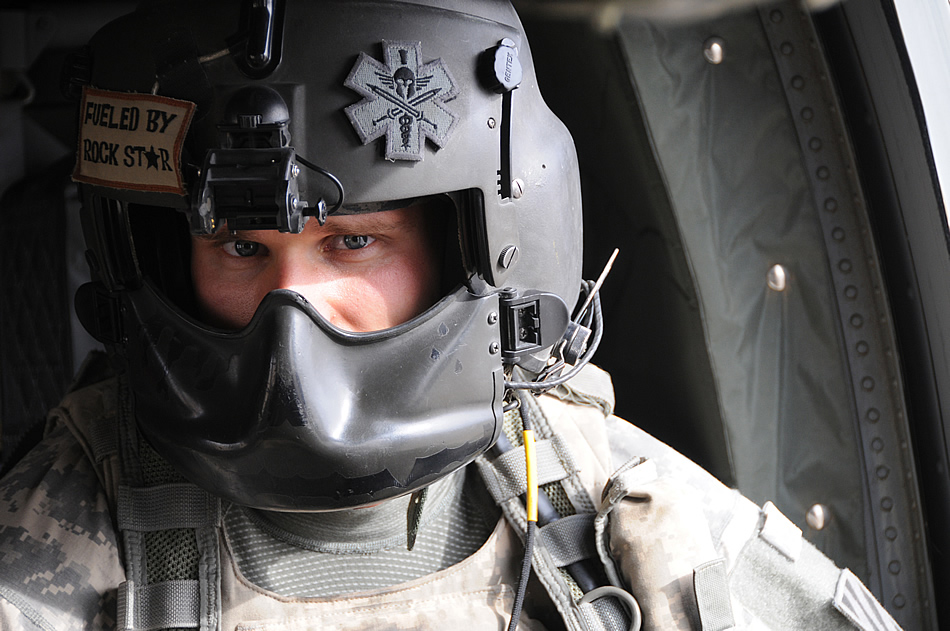 U.S. Army Sgt. Daniel Schmitt, a flight medic for the General Support Aviation Battalion from Hunter Army Airfield, Ga., assigned to Forward Operating Base Ghazni, Afghanistan, prepares for a "hot unload" while on a training mission with thirty members of a Polish army infantry unit, Nov. 4. The medics conducted training on procedures for proper loading and unloading of causalities onto waiting aircraft. Photo by Tech. Sgt. Rebecca Corey