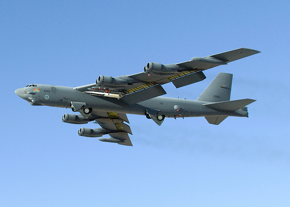 An Air Force Flight Test Center B-52H Stratofortress performs a captive carry flight of the X-51A WaveRider Dec. 9, 2009, over Edwards Air Force Base, Calif. The captive carry mission is a key test milestone to ready the X-51's scramjet engine during the vehicle's first powered hypersonic flight in early 2010. (U.S. Air Force photo/Mike Cassidy)