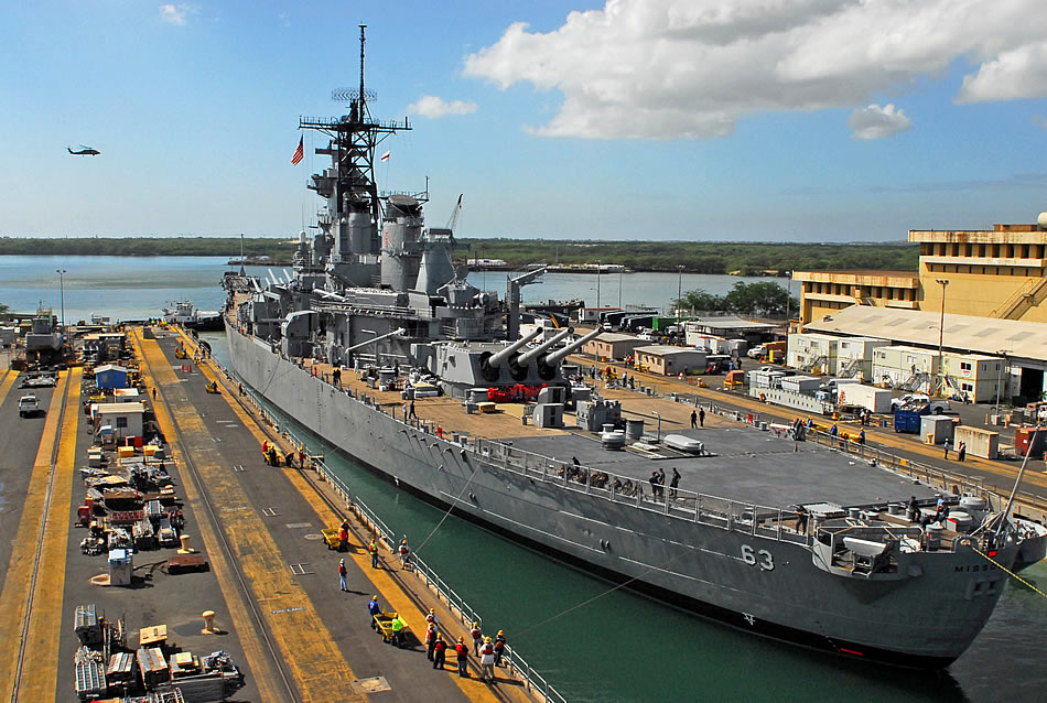 PEARL HARBOR (Jan. 7, 2010) The battleship EX-USS Missouri (BB 63) is being undocked by Pearl Harbor Naval Shipyard workers to begin its 2-mile journey back to Ford Island. (U.S. Navy photo by Machinist's Mate Fireman Dustan Longhini)