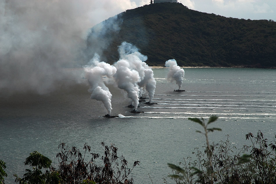 HAT YAO, Thailand (Feb. 4, 2010) Republic of Korea amphibious assault vehicles release a smoke screen before hitting the beach during a Cobra Gold 2010 amphibious landing demonstration at Hat Yao Beach during. Cobra Gold is a joint and coalition multinational exercise hosted annually by the Kingdom of Thailand. (US Navy photo by Lt. Cmdr. Denver Applehans)
