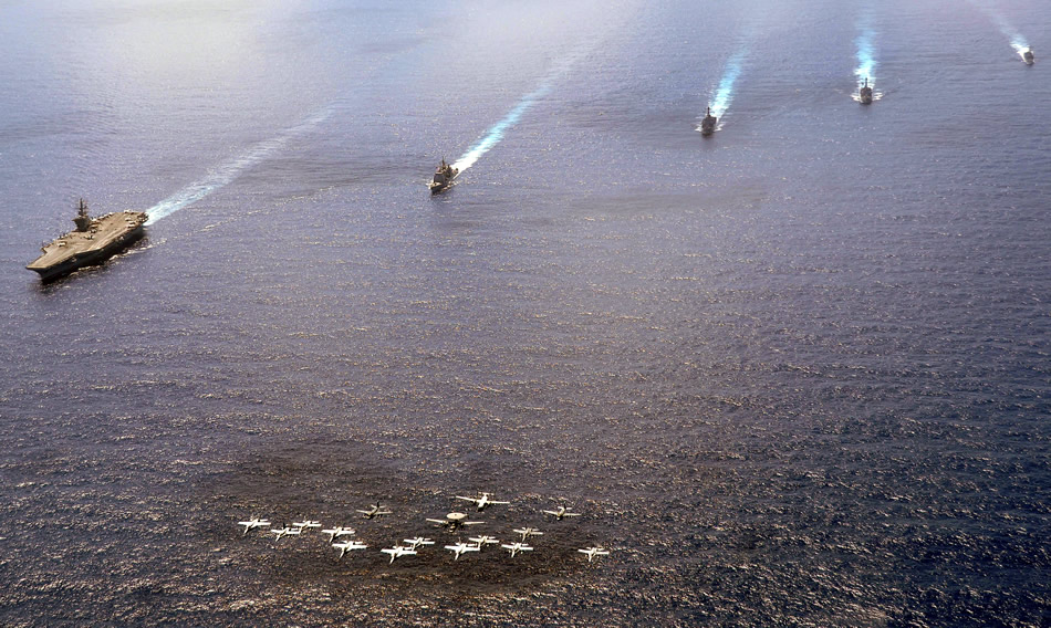 Carrier Strike Group 11 ships and aircraft lead by the USS Nimitz (far left) operate in formation in the South China Sea.